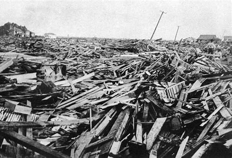 By morning, September 8th, 1900, Galveston lies in matchsticks, a dam of debris and death now barring the sea that built it, the dead and missing, enumerable. Telegrams received in Houston on September 10th read, “…the City of Galveston is in ruins.”