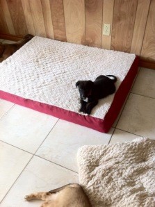 Finally, everyone is in the living room, wait, no, there’s only twelve, so I go into the backyard and sure enough, there’s Cadence sitting by the corner of the fence, without a care in the world. I scoop her up and go inside, trying not to let the others back out. By this time in the living room there’s lots of running, slurping, crunching, fighting over treats, toys, beds and me, but suddenly like magic they all pass out. While they nap, I sit on the floor, several pups snuggled against me. There are puppies everywhere, making small sweet sounds in their sleep, some on the beds, some on the cool floor, but almost everyone is sleeping next to someone else. Occasionally someone will get up and then plop back down somewhere else, but peace reigns for about 30 minutes.