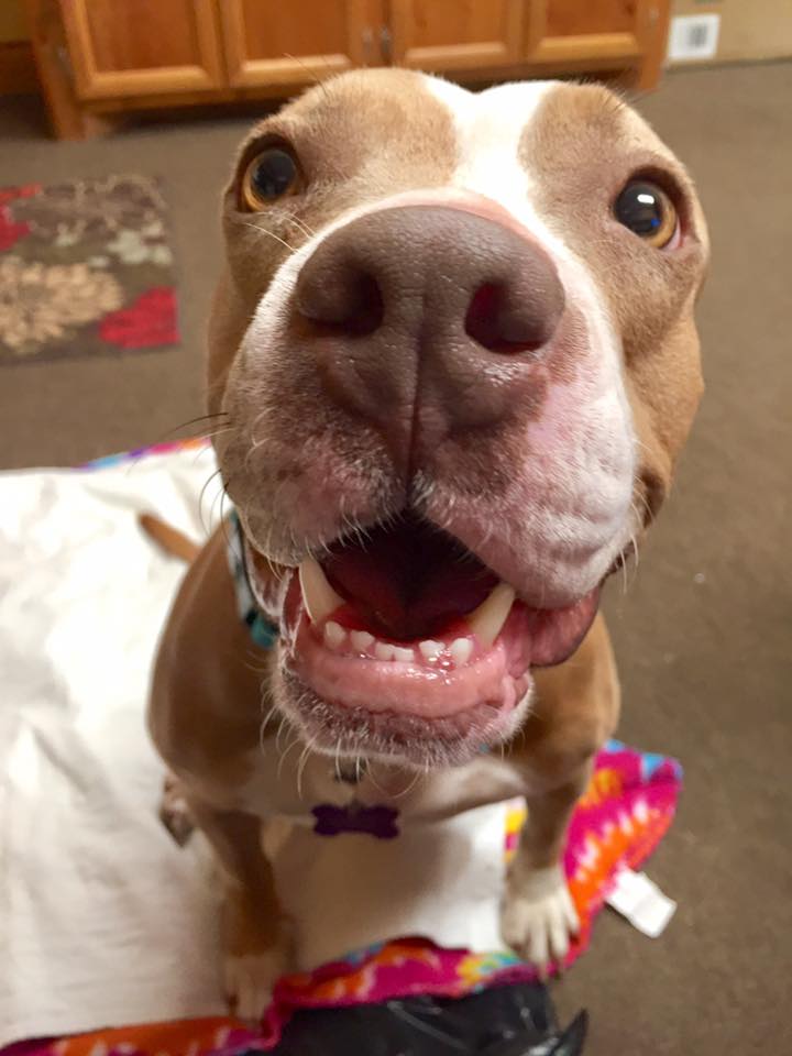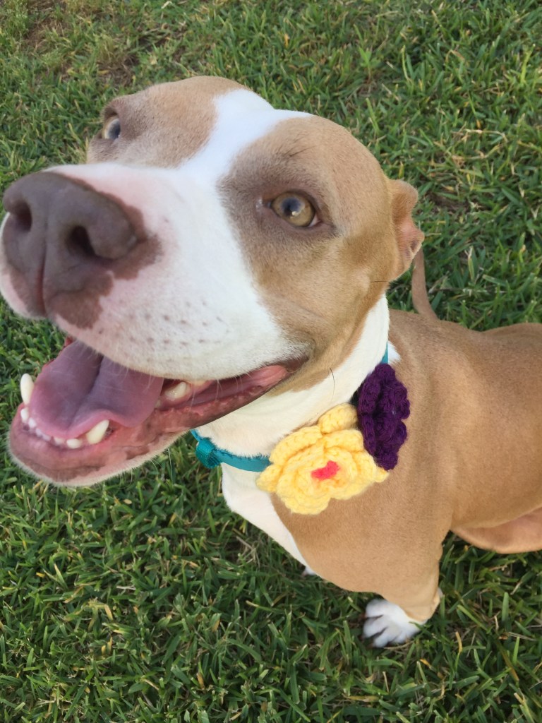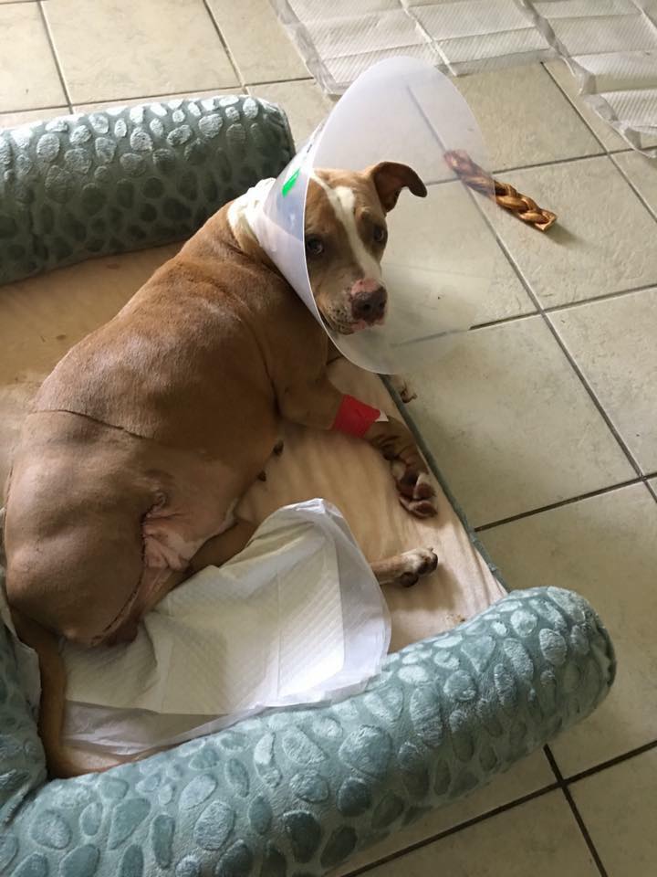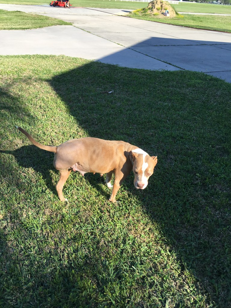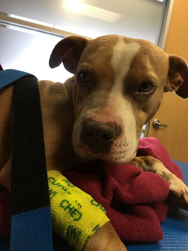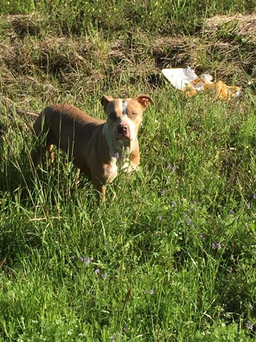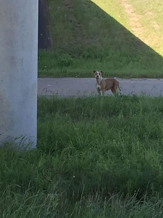 UPDATE: Sandy was a small pittie left to fend for herself beneath a freeway next to the San Jacinto River. She was spotted by a local rescuer who was providing food until a rescue could be arranged. Unfortunately, Sandy was hit by a car and discovered the next day with a compound fracture and many cuts and bruises. The vet was unable to save her leg and Sandy lost one of her back legs, but after she healed, she learned to walk and then run again with the help of her fosters. This sweet girl was adopted by a loving family in Michigan and is living a wonderful life and has left all her pain and tragedy in the past.